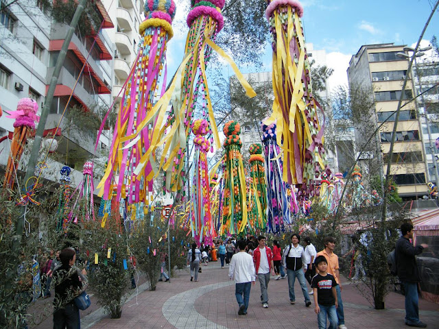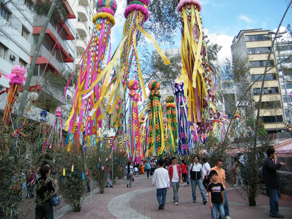 até agosto. As ruas do bairro da Liberdade são decoradas com bambus e papéis